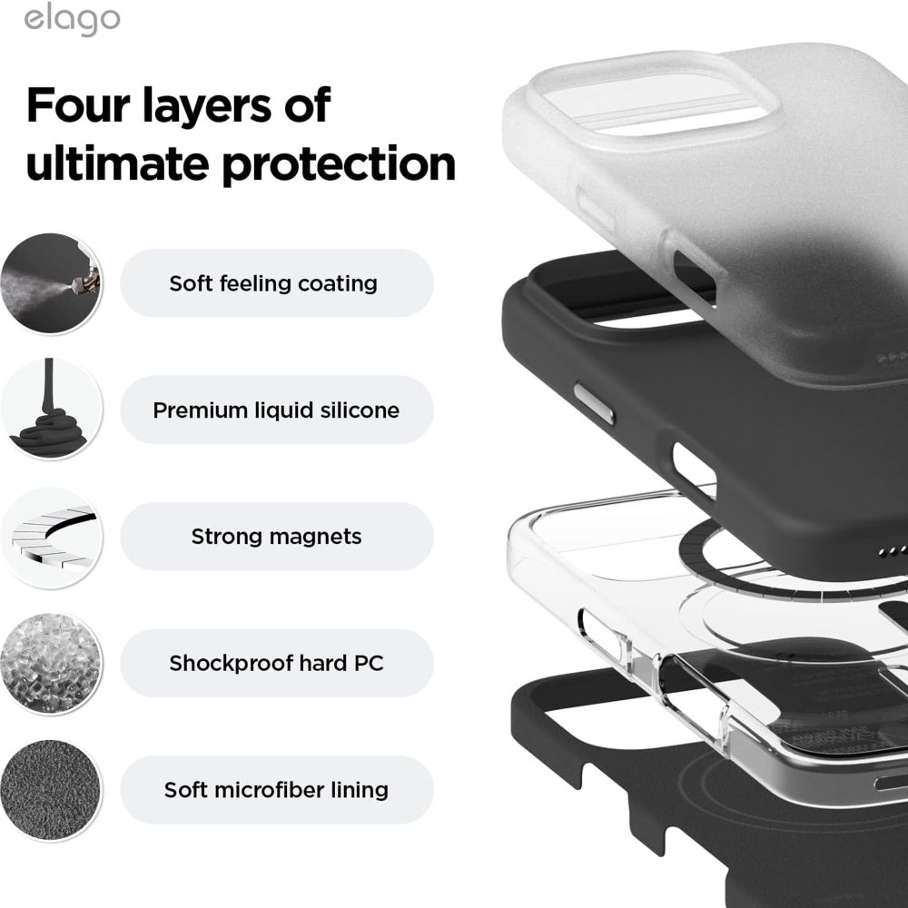 ELAGO MagSafe Silicone Case za iPhone 16 Pro izrađena je od mekane, ali izdržljive silikonske prevlake. Precizni su izrezi omogućeni su za neometan pristup svim gumbima, portovima i MagSafe funkcijama. Tanki dizajn čuva elegantan izgled uređaja, a ugodan osjećaj na dodir pruža siguran grip. Kućište štiti iPhone od ogrebotina i udaraca, dok MagSafe magnetski sustav omogućuje stabilno povezivanje dodatne opreme i punjenje.