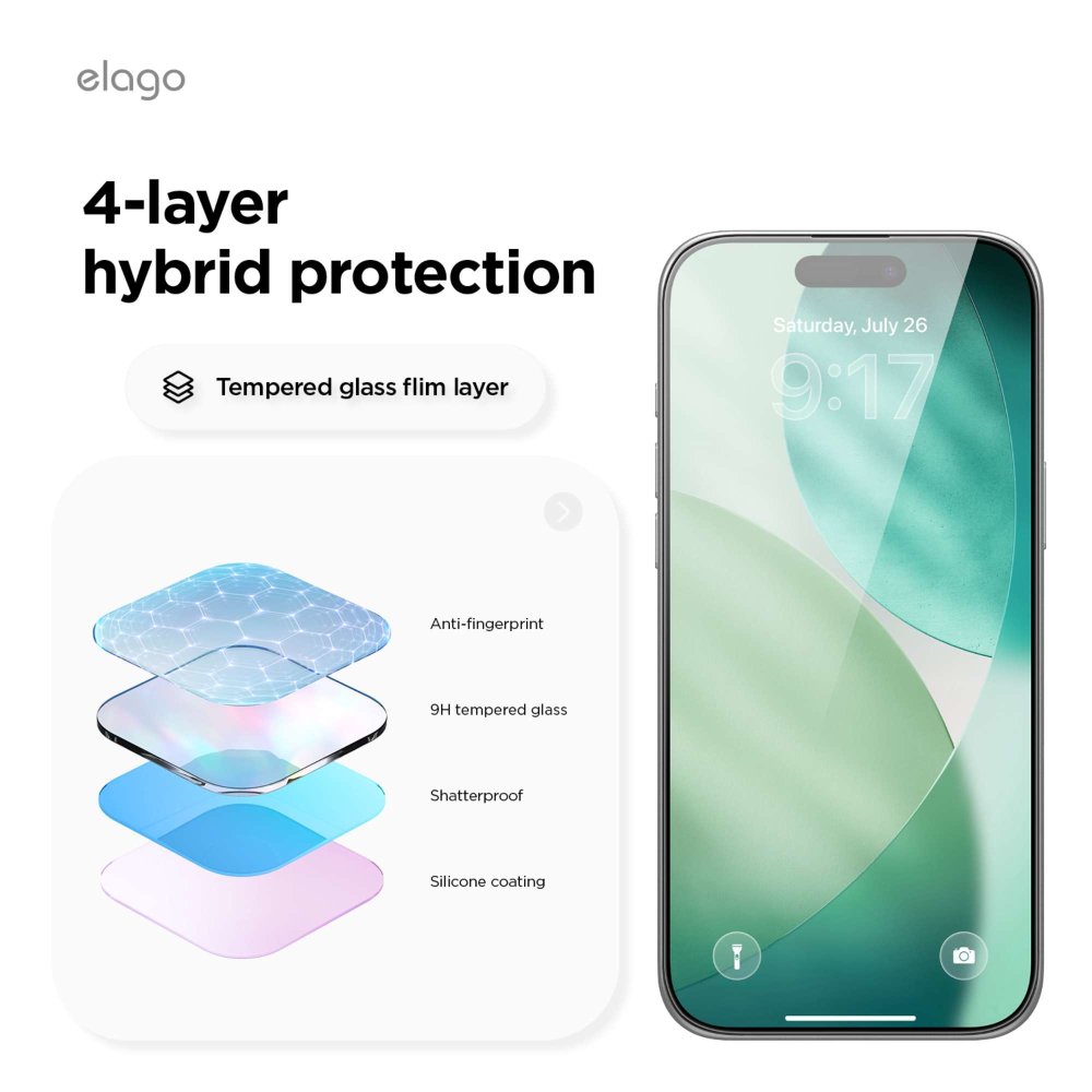 ELAGO Tempered Glass Protector za iPhone 17 Pro Max štiti ekran od ogrebotina, udaraca i prašine, uz potpuno očuvanje jasnoće i osjetljivosti dodira.