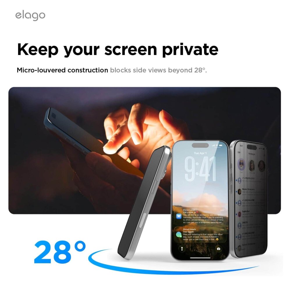 Elago zaštitno staklo s Privacy Shieldom za iPhone Air štiti vaš zaslon od neželjenih pogleda, blokirajući prikaz sa strane u portretnom načinu rada, dok se u pejzažnom načinu sadržaj može dijeliti. Idealno za putovanja, kafiće i otvorene urede.