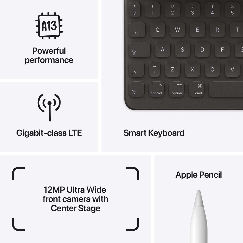 iPad (9. generacije) objedinjuje svestranost, učinkovitost i jednostavnost uporabe u elegantnom uređaju spremnom za svakodnevne zadatke, učenje, zabavu i kreativnost. Opremljen je snažnim čipom A13 Bionic, prekrasnim 10,2-inčnim Retina zaslonom1, naprednim kamerama s Center Stage tehnologijom i podrškom za Apple Pencil (1. generacije) sve uz intuitivan iPadOS koji otvara nove mogućnosti za rad i igru.