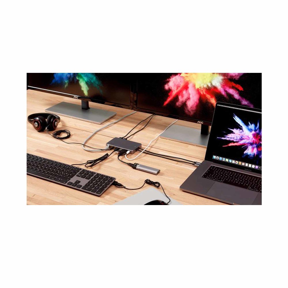 LMP Display Dock 2 ima sve standardne video priključke i podržava do dva monitora na 4K@60 Hz. To ga čini najsveobuhvatnijim USB-C video priključkom na tržištu: 2x HDMI (4K@60 Hz), Mini DisplayPort (4K@60 Hz), DisplayPort (4K@60 Hz), DVI (1080p@60 Hz) i VGA (1080p@60 Hz). Zahvaljujući dvostrukoj USB-C vezi s glavnim računalom (Mac), Display Dock 2 vam omogućuje da proširite svoj video sadržaj na dva vanjska zaslona (podrška za dvostruki 4K monitor/prošireni način rada), svaki s maksimalnom rezolucijom i brzinom osvježavanja. To vam omogućuje pokretanje do tri različite slike istovremeno i neovisno. Idealan je za profesionalnog korisnika, strastvenog kinematografa ili strastvenog igrača – iskoristite prednosti 4K videa s visokofrekventnim osvježavanjem od 60 Hz. Uz 6 video priključaka, LMP USB-C Display Dock 2 povezuje se s vanjskim svijetom putem Gigabit Etherneta i ima dva USB 3.0 priključka za prijenos podataka – od kojih je jedan optimiziran za punjenje pametnog telefona ili tableta zahvaljujući implementiranom BC 1.2 standard. Dva USB-C priključka obavljaju različite zadatke - jedan kao glavni priključak za punjenje (Power Delivery 3.0/100 W) i jedan za prijenos podataka do 5 Gbps. Audio izlaz (3,5 mm jack) omogućuje spajanje zvučnika ili slušalica. Za punu funkcionalnost, dva USB-C priključna kabela moraju biti spojena na glavno računalo.