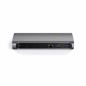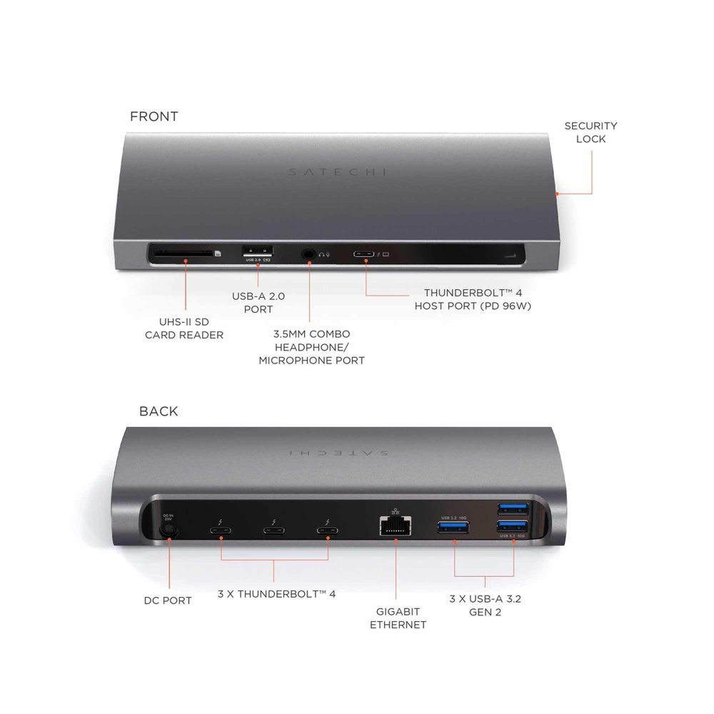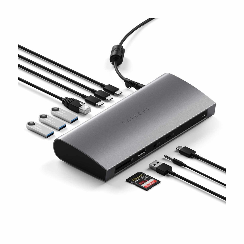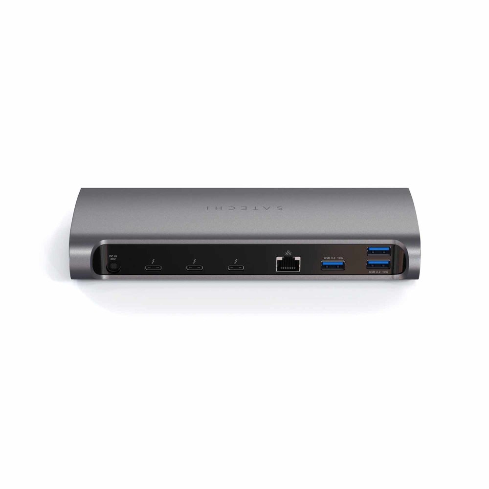 Satechi Thunderbolt 4 Dock je napredna priključna stanica u Space Gray boji. Ima tri Thunderbolt 4 porta (do 40 Gb/s), četiri USB-A priključka, SD čitač kartica (UHS-II), Gigabit Ethernet i 3,5 mm audio ulaz/izlaz. Omogućuje punjenje do 96 W putem host porta i istovremeno povezivanje više uređaja i vanjskih monitora. Zahvaljujući aluminijskom kućištu, dock ostaje stabilan i tiho se hladi tijekom rada. Kompatibilan je s macOS i Windows uređajima, bez potrebe za dodatnim upravljačkim programima.