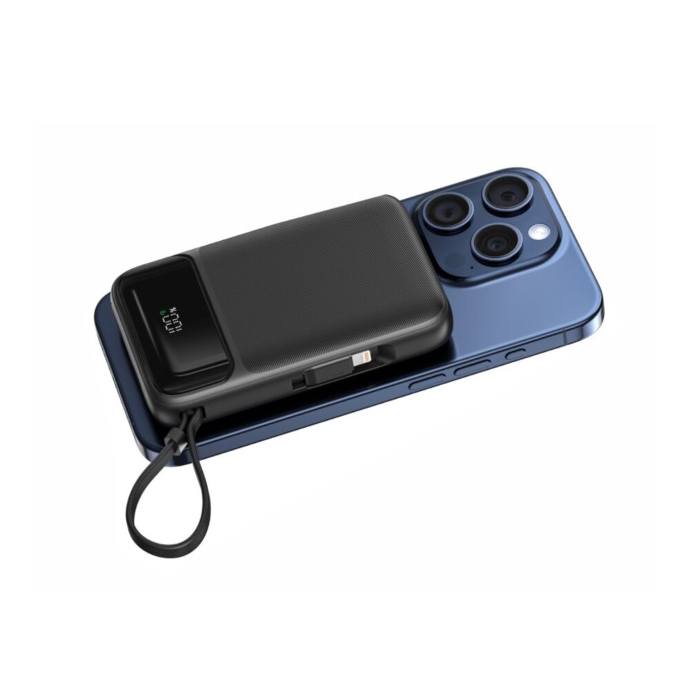 Powerbank podržava brzo punjenje do 20 W (Power Delivery) putem USB-C priključka i istovremeno omogućuje bežično punjenje (Qi) do 15 W. Ugrađeni USB-C i Lightning kabeli čine ga iznimno praktičnim za korištenje, jer ne zahtijeva dodatne kabele — idealno rješenje za putovanja i svakodnevnu upotrebu.